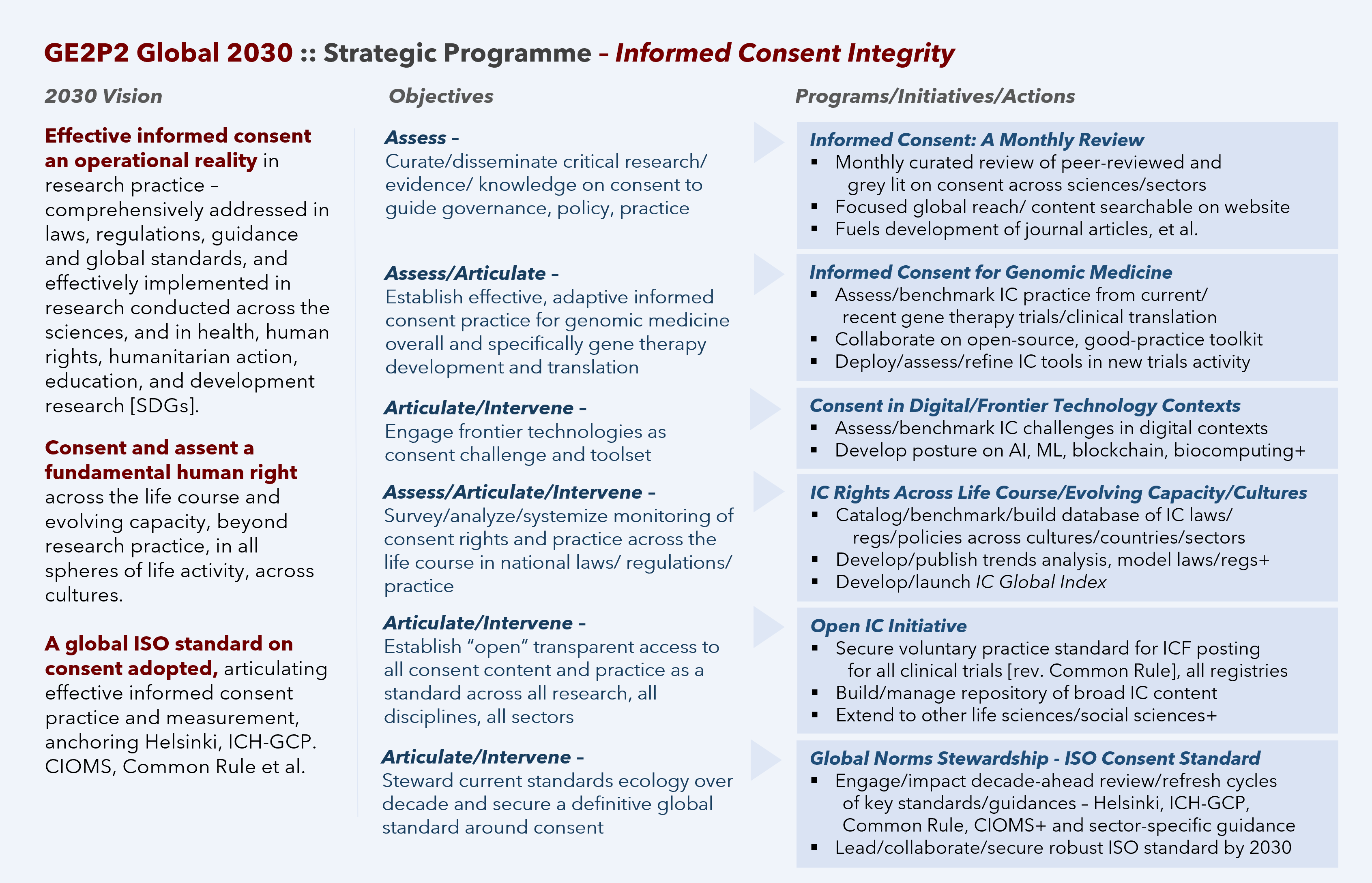 GE2P2 Global 2030 :: Strategic Programme – Informed Consent Integrity Share this: Click to share on Facebook (Opens in new window) Facebook Click to share on X (Opens in new window) X Like Loading...