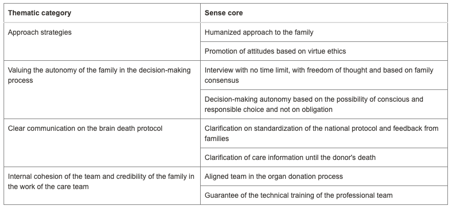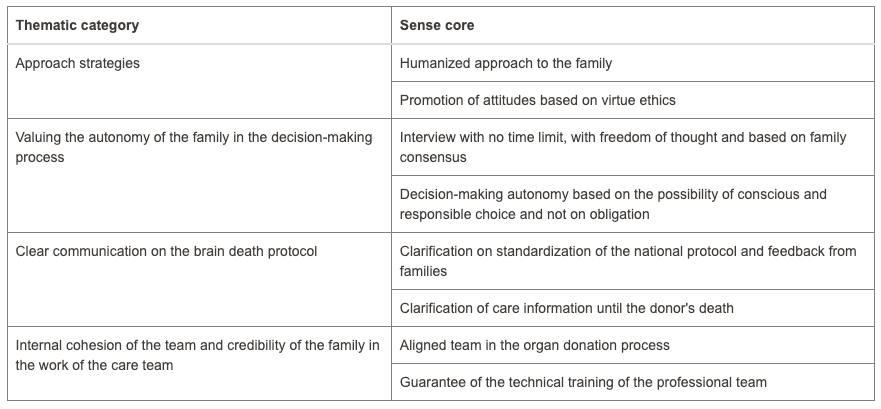 Fewer donations are being made in Brazil to meet the growing organ demand. Organ donation in Brazil reached an average of 53% consent. However, hospitals in Paraná have reached a level of 94.2%. What reasons could be given for these levels? Accordingly, this study aimed to understand the causes involved in decision-making to donate organs. The methodology used was qualitative based on a case study. Data was collected at a hospital in Toledo, a city in Paraná, through documentary research and semi-structured interviews with two distinct groups: professionals responsible for the family approach to donation and five families consenting to donation. The search for data was restricted to the period between 2015 and 2023. Data analysis used Bardin’s content analysis. The results were organized into four categories in the first group, and two categories in the second group, suggesting that aspects linked to bioethical references present in the interview, such as beneficence and autonomy, contribute to the emergence of high rates of family consent for organ donation in the hospital studied. It is recommended for future research to test successful interview models to reverse the current organ donation rates in Brazil.